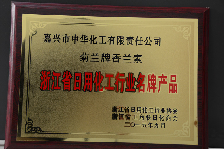 2015年12月4日,浙江省日化行業(yè)協(xié)會五屆六次理事會在浙江鐵道大廈順利召開。會上對浙江省日化行業(yè)名牌產品進行了頒獎,我公司生產的“菊蘭”牌香蘭素、乙基香蘭素榮獲浙江省日化行業(yè)名牌產品。公司注冊商標“久珠”現(xiàn)為中國馳名商標、浙江省著名商標和浙江省出口名牌,“久珠”牌香蘭素、乙基香蘭素為浙江省名牌產品。相信“久珠”和“菊蘭”的珠聯(lián)璧合,一定能將中華化工的香蘭素事業(yè)做得更大更強。