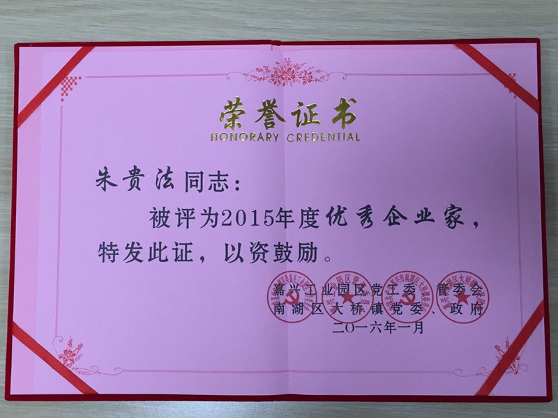 2016年1月28日,南湖區(qū)大橋鎮(zhèn)(嘉興工業(yè)園區(qū))2015年度總結(jié)表彰大會(huì)在鎮(zhèn)政府禮堂順利召開(kāi),我公司憑借較好的業(yè)績(jī),榮獲了2015年度大橋鎮(zhèn)“十強(qiáng)”工業(yè)企業(yè)和納稅超五千萬(wàn)元突出貢獻(xiàn)獎(jiǎng);朱貴法榮譽(yù)董事長(zhǎng)榮獲“優(yōu)秀企業(yè)家”榮譽(yù)稱號(hào)。