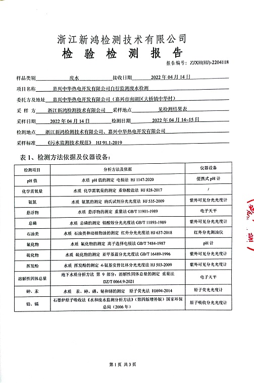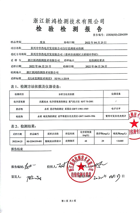 報告名稱:中華熱電2022.4月廢水檢測報告