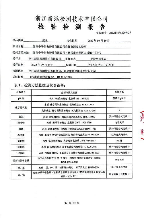 報(bào)告名稱:中華熱電2022年9月廢水檢測(cè)報(bào)告