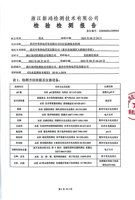 報告名稱:中華熱電2023.8月廢水檢測報告