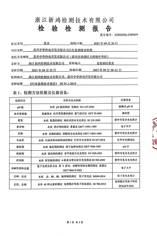 報告名稱:中華熱電2023.9月廢水檢測報告