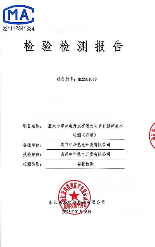 報(bào)告名稱:中華熱電2025年1月廢水檢測(cè)報(bào)告